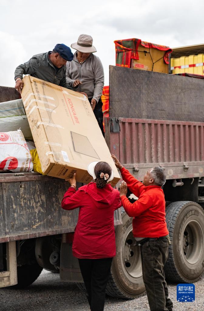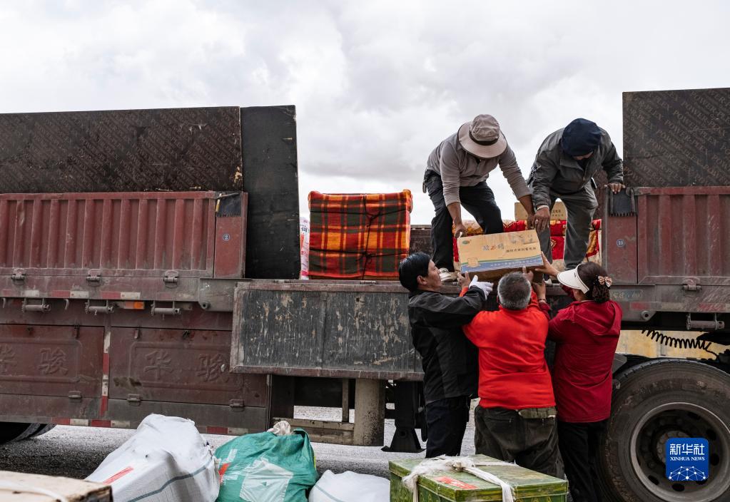 雙湖縣多瑪鄉果根擦曲村的村民將行李搬上貨車(7月12日攝)。新華社記者 周荻瀟 攝