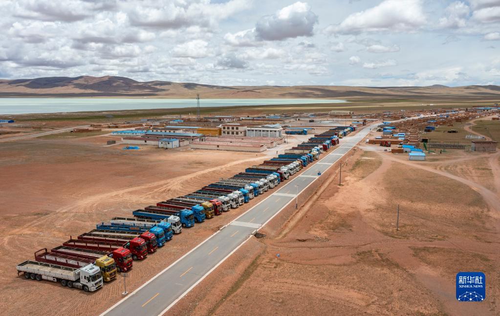 運輸家具的貨車在雙湖縣多瑪鄉果根擦曲村集合(7月12日攝,無人機照片)。新華社記者 孫非 攝