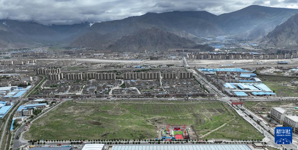 7月5日拍攝的拉薩市年產30萬噸啤酒建設項目奠基儀式現(xiàn)場(無人機照片)。新華社記者 晉美多吉 攝