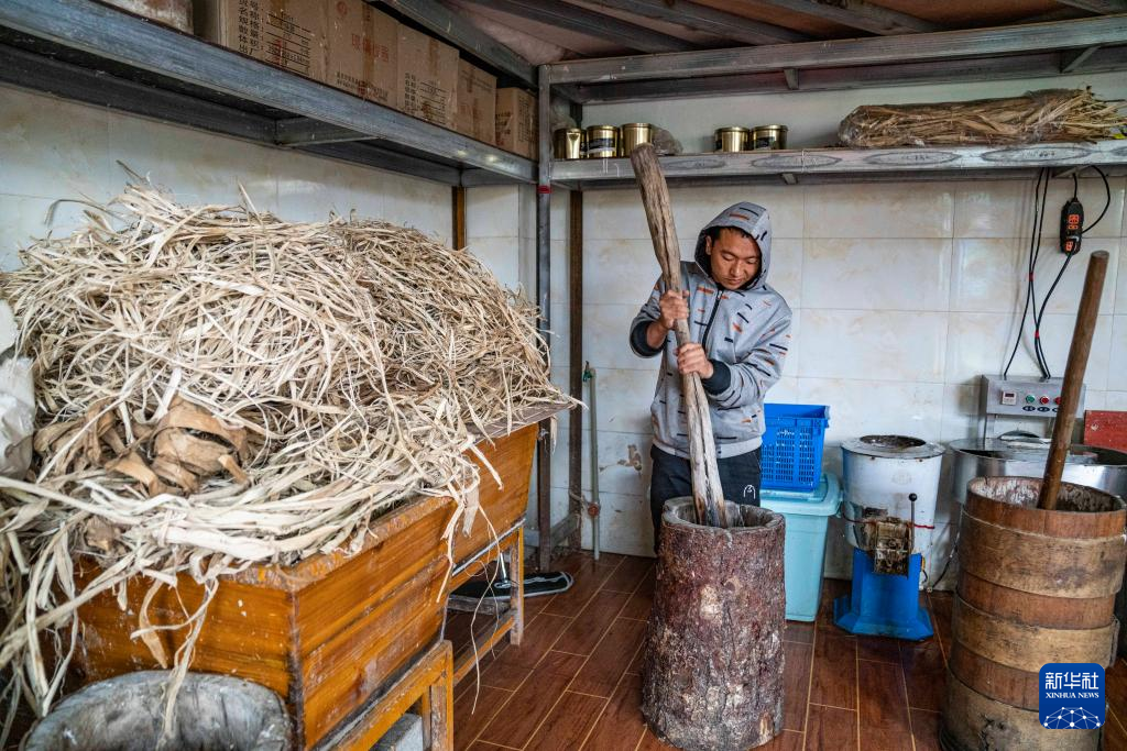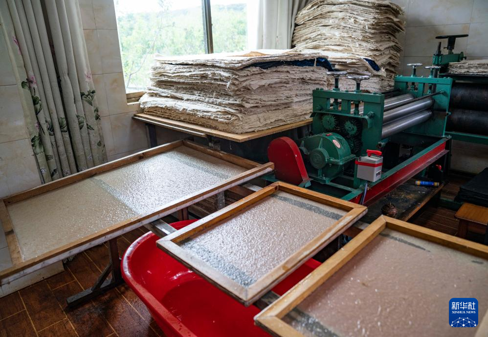 在西藏米林市羌納鄉西嘎門巴村,南迦巴瓦童螺嘎布工藝品農民專業合作社的工作人員正在制作藏紙(7月26日攝)。新華社記者 孫非 攝