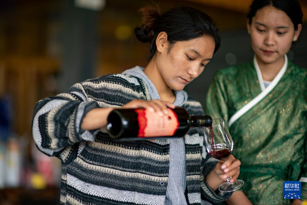 7月26日,桑日縣一家葡萄酒企業的員工曲珍在展示公司生產的葡萄酒。新華社記者 姜帆 攝