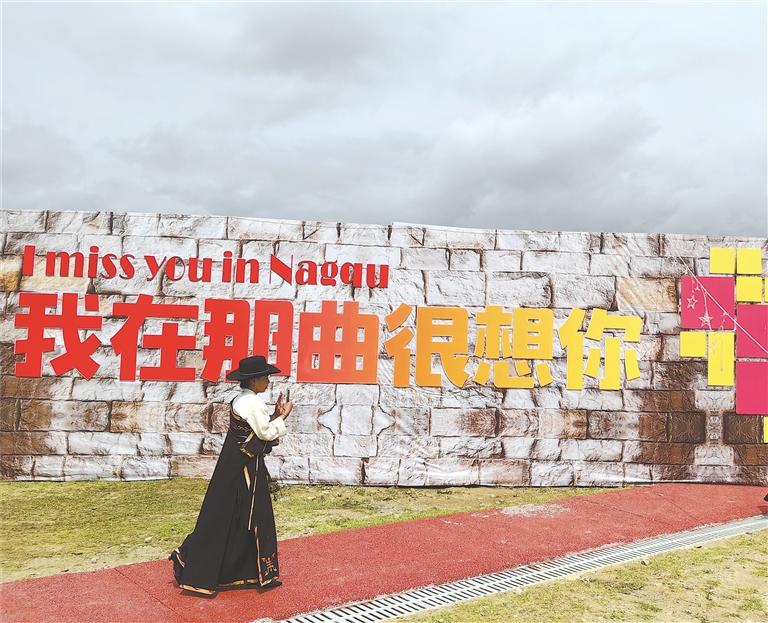 盛裝參加賽馬節的群眾經過“我在那曲很想你”打卡點。