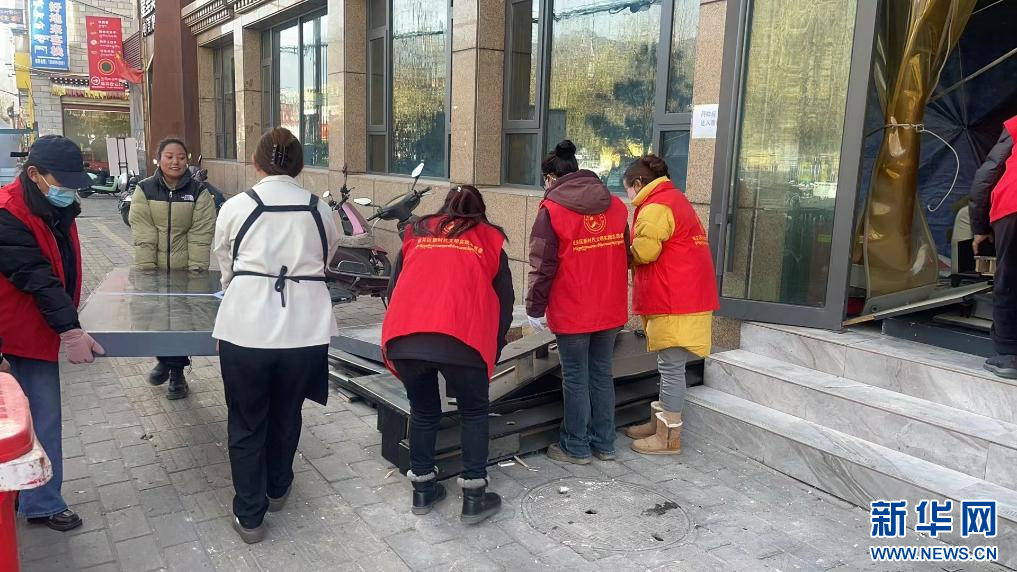 在西藏拉薩市功德林街道幸福社區,志愿者正在協助商戶處理建筑垃圾(12月3日攝)。新華社發(娜拉 攝)