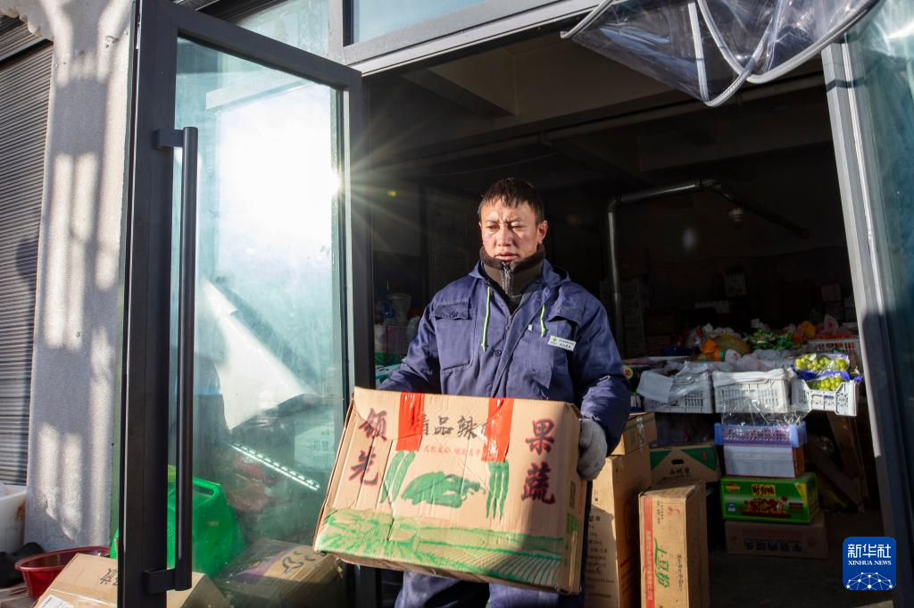 申扎縣供銷合作社的配送員次仁桑珠在縣城總店為馬躍鄉(xiāng)貝嘎四村偏遠(yuǎn)鄉(xiāng)鎮(zhèn)果蔬配送試點(diǎn)項(xiàng)目直銷點(diǎn)上貨(1月5日攝)。新華社記者 曹檳 攝