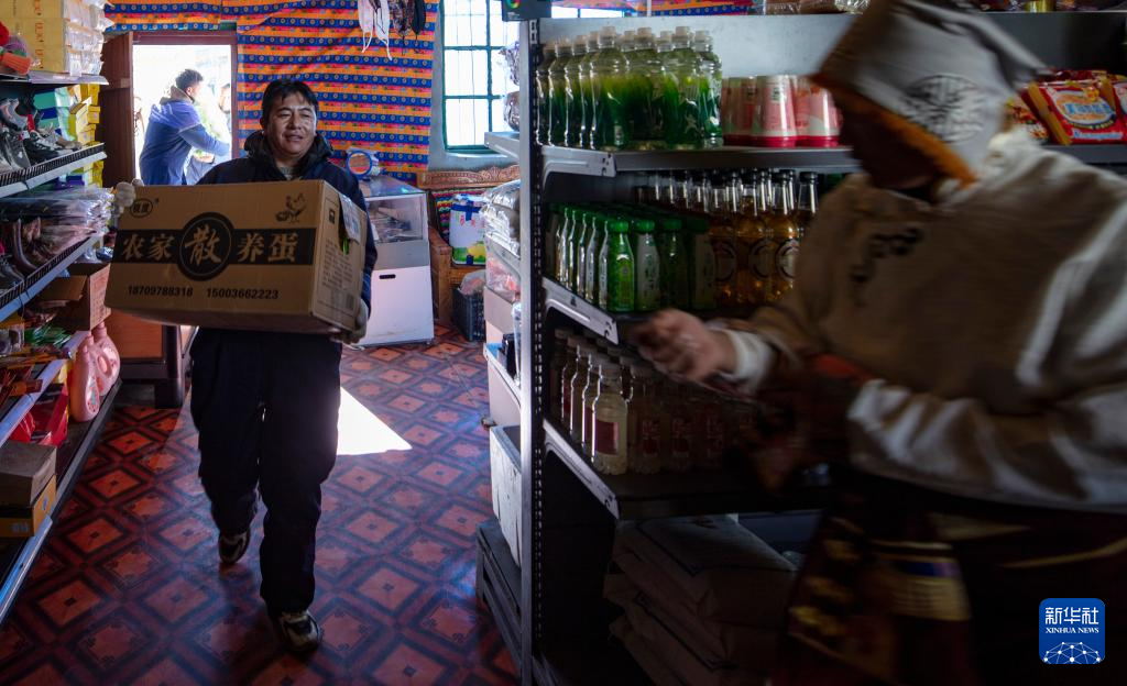 申扎縣供銷合作社的配送員巴拉在馬躍鄉(xiāng)貝嘎四村偏遠(yuǎn)鄉(xiāng)鎮(zhèn)果蔬配送試點(diǎn)項(xiàng)目直銷點(diǎn),幫店主西熱加措搬運(yùn)新鮮果蔬(1月5日攝)。新華社記者 姜帆 攝