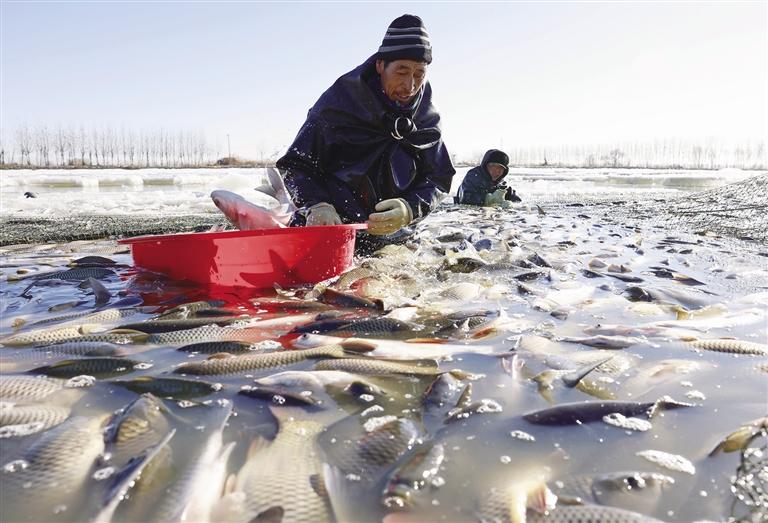 河北省唐山市豐南區老鋪村的淡水魚養殖戶在魚塘捕魚。 文圖均來自新華社