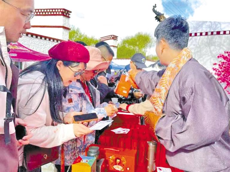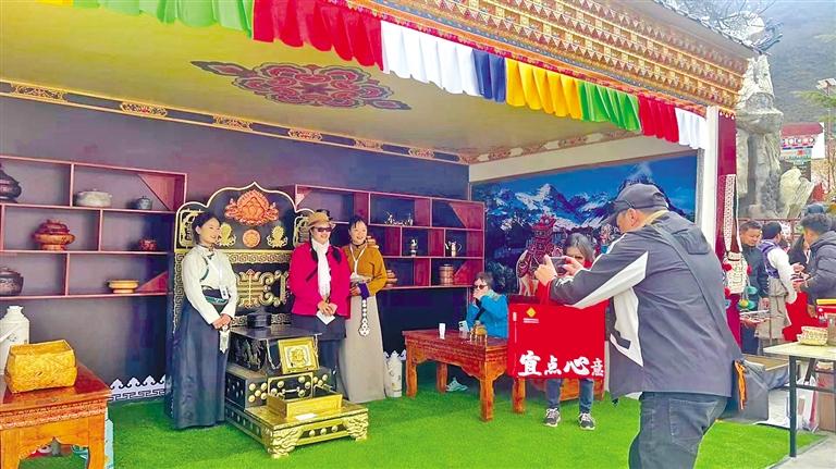 活動現場,工作人員通過組織游客參與拍照、打卡、集章等方式,依次通過“桃花圣地拍照打卡區”“次仁的家藏式體驗館”和“供銷小店展銷圣地”,集齊3枚印章后參與抽獎活動和美食品鑒。