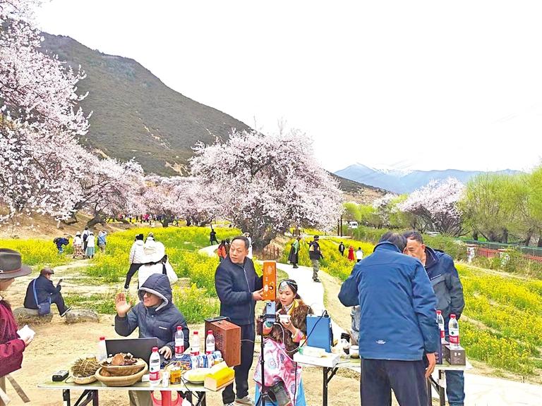 林芝市職業技術學校學生在嘎拉村直播,宣傳推介桃花旅游文化節、工布民俗風情及農特產品等。 記者 謝筱純 王珊 攝