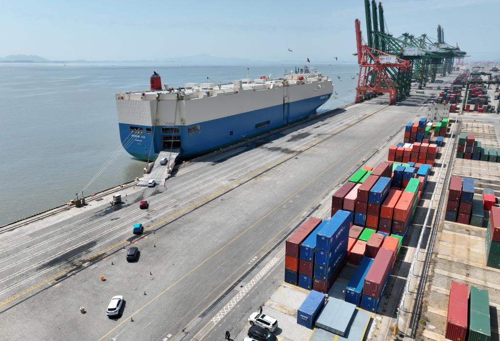 3月12日,準備出口的車輛從福州港江陰港區碼頭駛上遠洋滾裝輪(無人機照片)。新華社記者林善傳攝