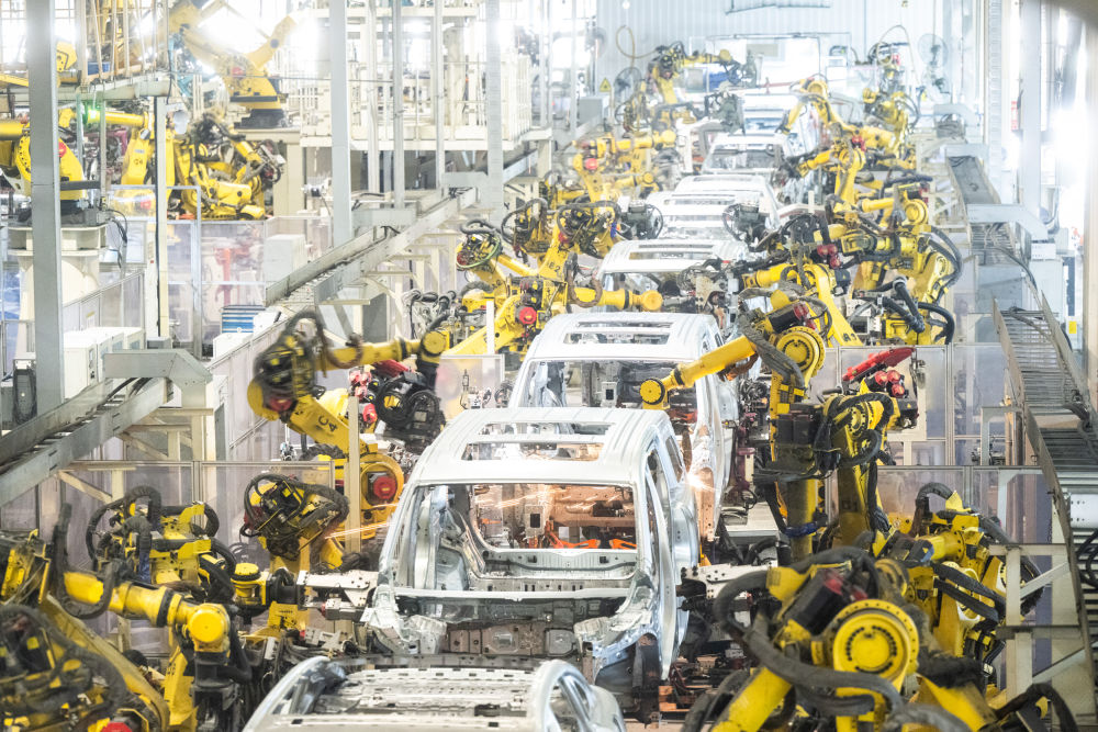 4月1日,在位于湖北武漢經開區的嵐圖汽車電動化焊裝車間,機器人在流水線上作業。新華社記者肖藝九攝