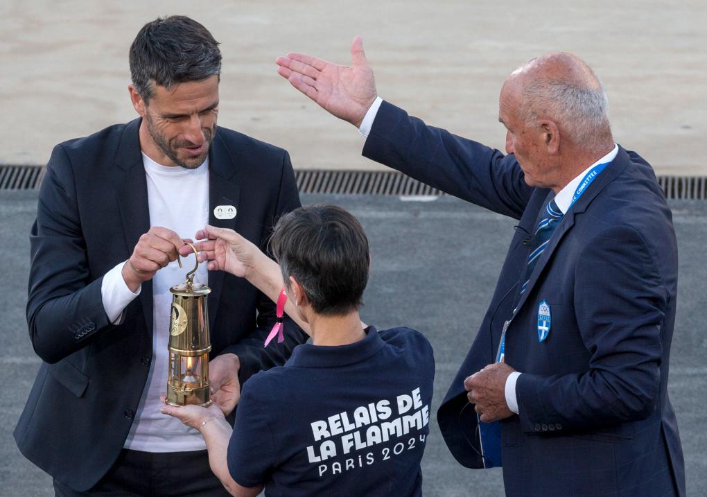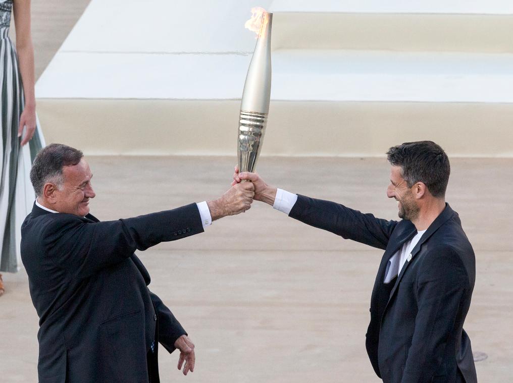 4月26日,巴黎奧組委主席埃斯坦蓋(左)將巴黎奧運會火種燈交給工作人員。新華社發(馬里奧斯·羅洛斯攝)