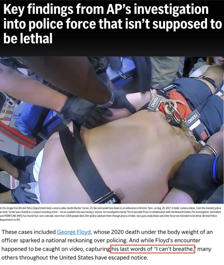 美聯(lián)社不久前主導的一項調(diào)查發(fā)現(xiàn),在2012年至2021年的十年間,美國警察使用身體約束、電擊、毆打等所謂“非致命性手段”導致至少1036人死亡,平均每周兩人。