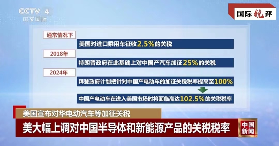 2018年3月,美國時任特朗普政府依據所謂“301調查”挑起對華貿易戰,先后對約3600億美元中國輸美商品加征高額關稅。2022年5月,在四年期對華加征關稅行動到期前,拜登政府宣布啟動相關復審程序。當地時間14日,美方發布了復審結果,宣布進一步提高對華關稅,涉及商品包括以電動汽車、鋰電池、光伏產品為代表的中國“新三樣”,以及關鍵礦產、半導體、鋼鋁、港口起重機、個人防護裝備等。