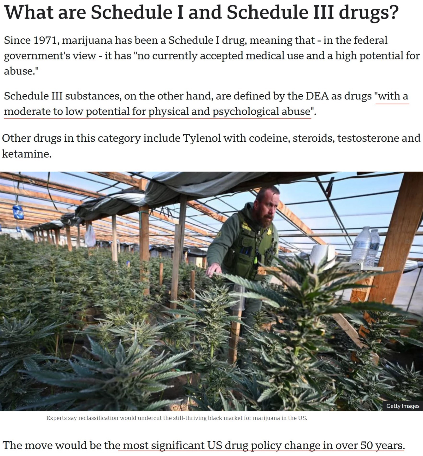 如果經過60天的公眾意見征詢期后最終獲批,新規則雖然不會在聯邦層面將大麻完全合法化,但會將其移出《美國聯邦管制物質法案》中列管海洛因等最危險毒品的“附表一”,轉而歸入列管氯胺酮和類固醇等危險性較低藥物的“附表三”。