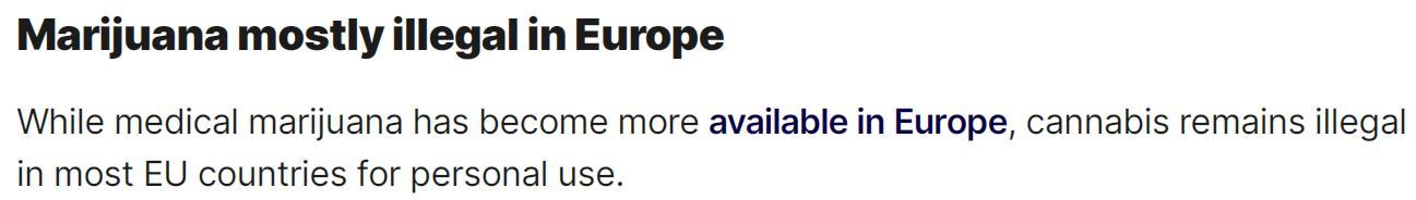 即使在毒品問題同樣嚴峻的歐洲,雖然醫用大麻越來越容易獲得,但在大多數歐盟國家,個人吸食大麻仍是非法行為。
