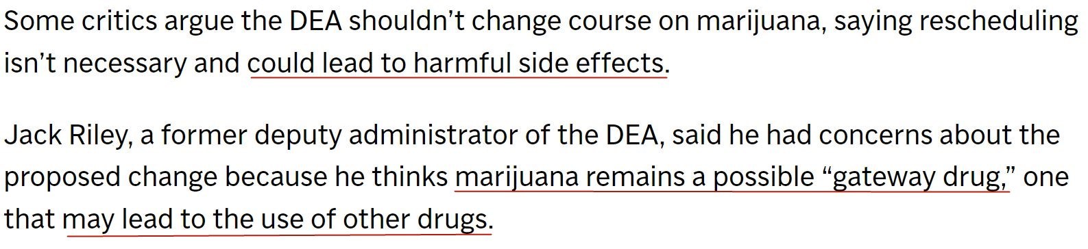 美國禁毒署前副署長杰克·萊利對擬議中的規則更改感到擔憂。他認為,大麻仍是一種“入門毒品”,可能導致對其他毒品的使用。