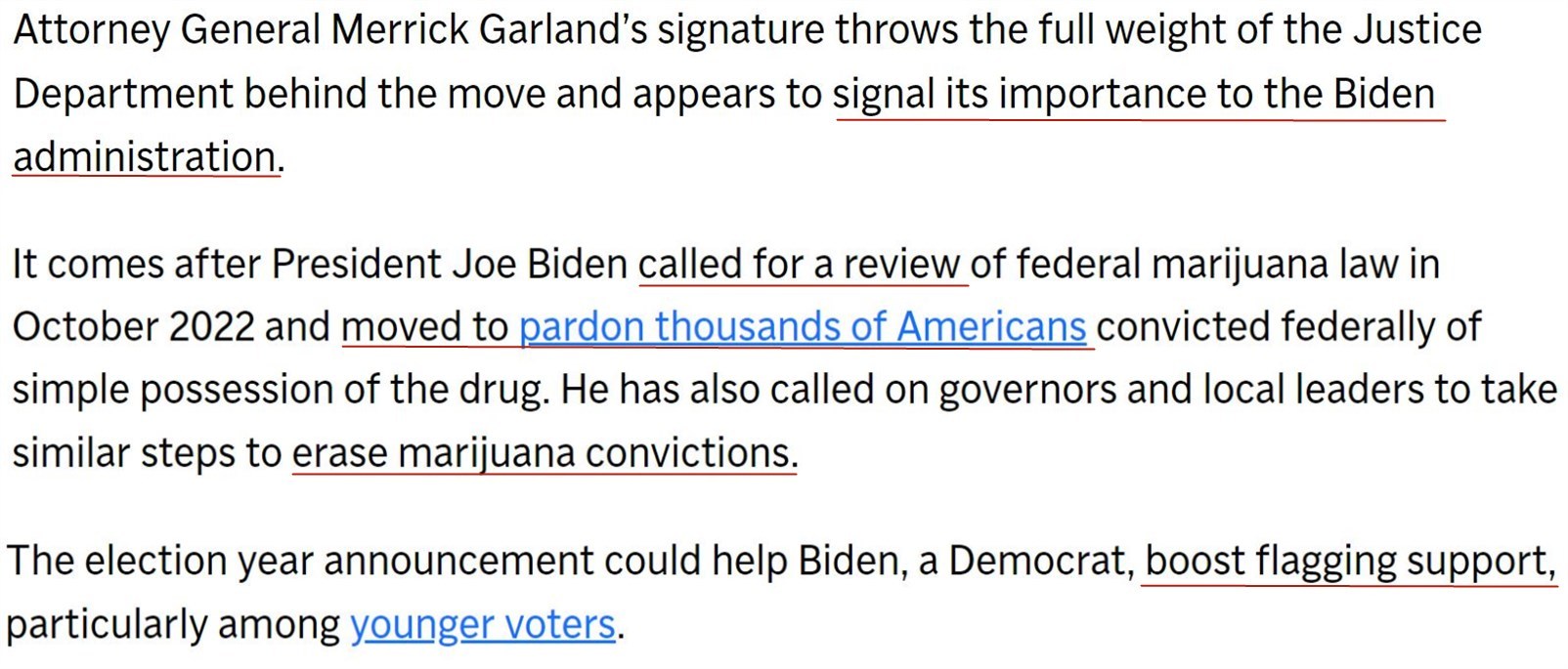 美聯社分析指出,美司法部對修改大麻分類的全力支持,表明了此舉對拜登政府的重要性。拜登在大選前夕推動大麻去罪化,就是為了吸引年輕選民的支持。