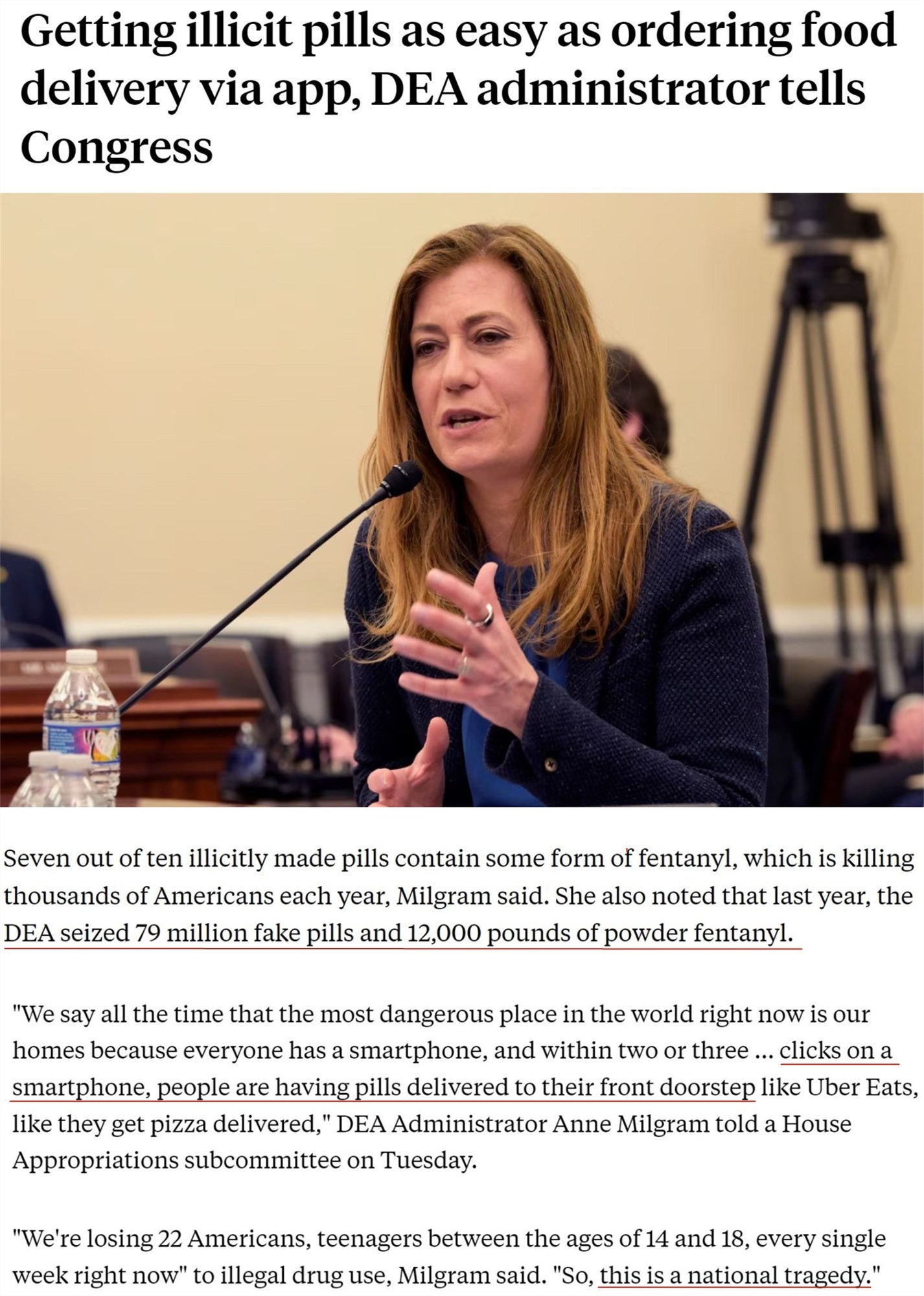 美國禁毒署署長安妮·米爾格拉姆本月早些時候告訴國會:“現在世界上最危險的地方就是我們的家,因為每個人都有智能手機,只要用手指點上兩三下,就能像在外賣平臺點比薩一樣,在家門口收到非法藥丸。”