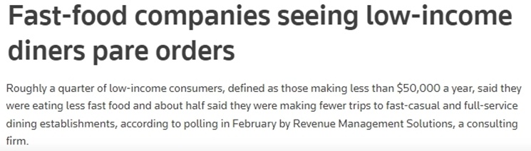 咨詢公司“收入管理解決方案”此前發布的一項民調結果顯示,年收入在5萬美元以下的美國人中,約有四分之一的人減少了快餐消費。