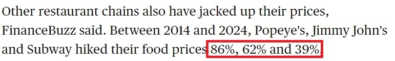 美國哥倫比亞廣播公司網站: 2014年至2024年間,“大力水手”“吉米·約翰”和“賽百味”的產品價格分別上漲了86%、62%和39%。