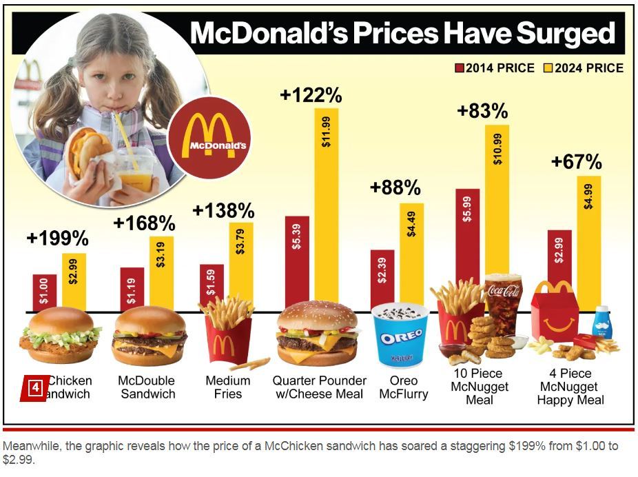 以麥當勞經典單品雙吉漢堡為例,2014年的平均價格為1.19美元,現在卻賣到3.19美元,漲價幅度高達168%。