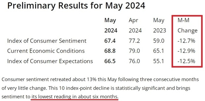 密歇根大學的最新調查顯示,由于預期通脹率和利率都將維持在高位,美國5月消費者信心指數(CSI)在連續三個月幾乎持平后較上月大幅回落了約13%,降至約半年來的最低水平。