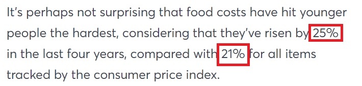 事實上,“食品通脹率”已經超過了整體通脹率:過去四年,食品價格上漲了25%,而所有商品的價格平均漲幅為21%。