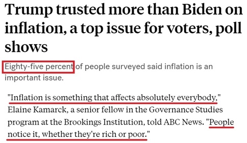 用布魯金斯學會高級研究員卡馬克的話說,“通脹是絕對會影響所有美國人的東西。人們都會注意到通脹,無論他們富裕還是貧窮”。