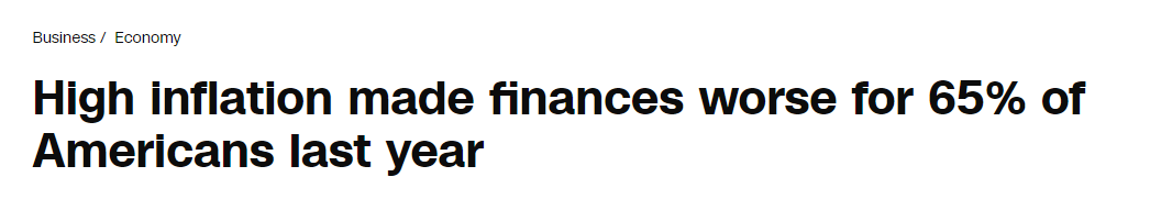 美聯(lián)儲近日發(fā)布的《2023年美國家庭經(jīng)濟(jì)狀況報告》(Economic Well-Being of US Households)顯示,65%的美國家庭的財務(wù)狀況因通脹而惡化,其中19%的人認(rèn)為財務(wù)狀況“嚴(yán)重惡化”。