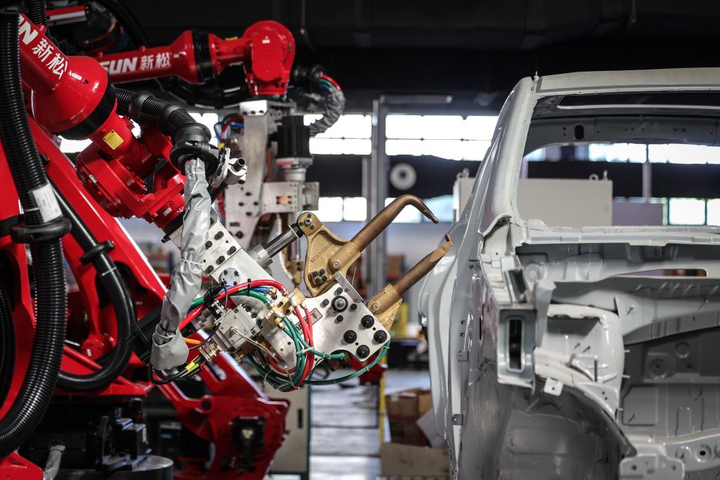 這是6月3日拍攝的點焊機器人。機器人被廣泛應用于產業轉型升級的現實場景中,它們能夠勝任繁重、危險或復雜的工作,提高生產效率和經濟效益。新華社記者潘昱龍攝