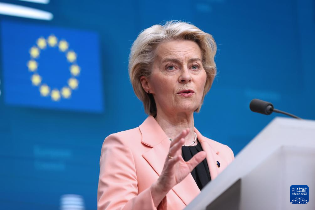 這是3月21日在比利時布魯塞爾拍攝的歐盟委員會主席馮德萊恩出席新聞發布會。新華社記者 趙丁喆 攝