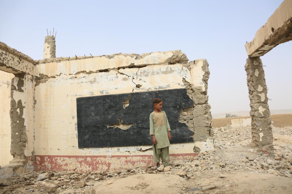 2022年8月23日,在阿富汗南部赫爾曼德省桑金地區(qū),一名男孩站在廢墟之中。桑金地區(qū)曾經最繁華的市場,如今遍布美軍空襲留下的一個個巨大彈坑。新華社發(fā)(塞夫拉赫曼·薩菲攝)