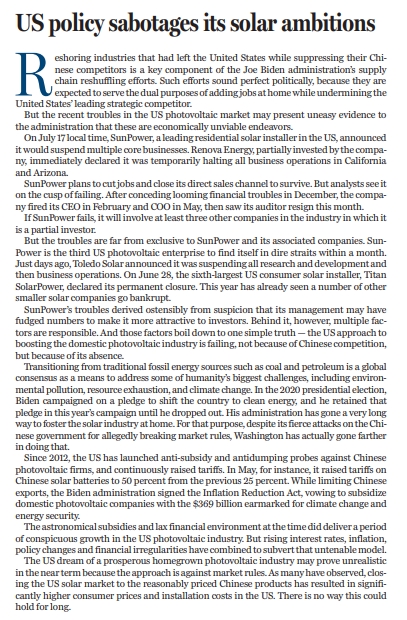 自2012年起,美國就開始對中國光伏企業發起反補貼和反傾銷調查,并不斷提高關稅。例如,今年5月,美國白宮宣布,對中國產太陽能電池征收的關稅將從原先的25%上調至50%。在限制中國對美出口的同時,拜登政府簽署的《通脹削減法案》還撥款3690億美元應對氣候變化、維護能源安全,承諾將借此對國內光伏企業實施補貼。
