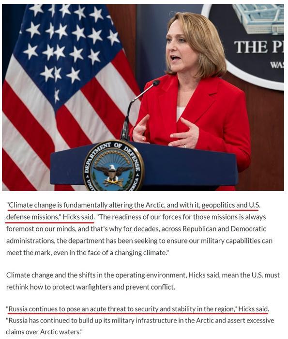 在發布這份文件時,美國國防部副部長希克斯在簡報會上公然聲稱,俄羅斯對北極地區的安全與穩定構成"嚴重威脅"。為此,美國必須制定戰略并確保美軍做好準備,以減輕在北極地區發生潛在突發事件的風險。