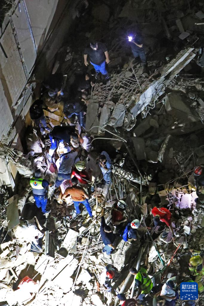 7月30日,在黎巴嫩貝魯特南郊,救援人員在以軍襲擊毀壞的建筑廢墟上搜尋幸存者。新華社發(比拉爾·賈維希攝)