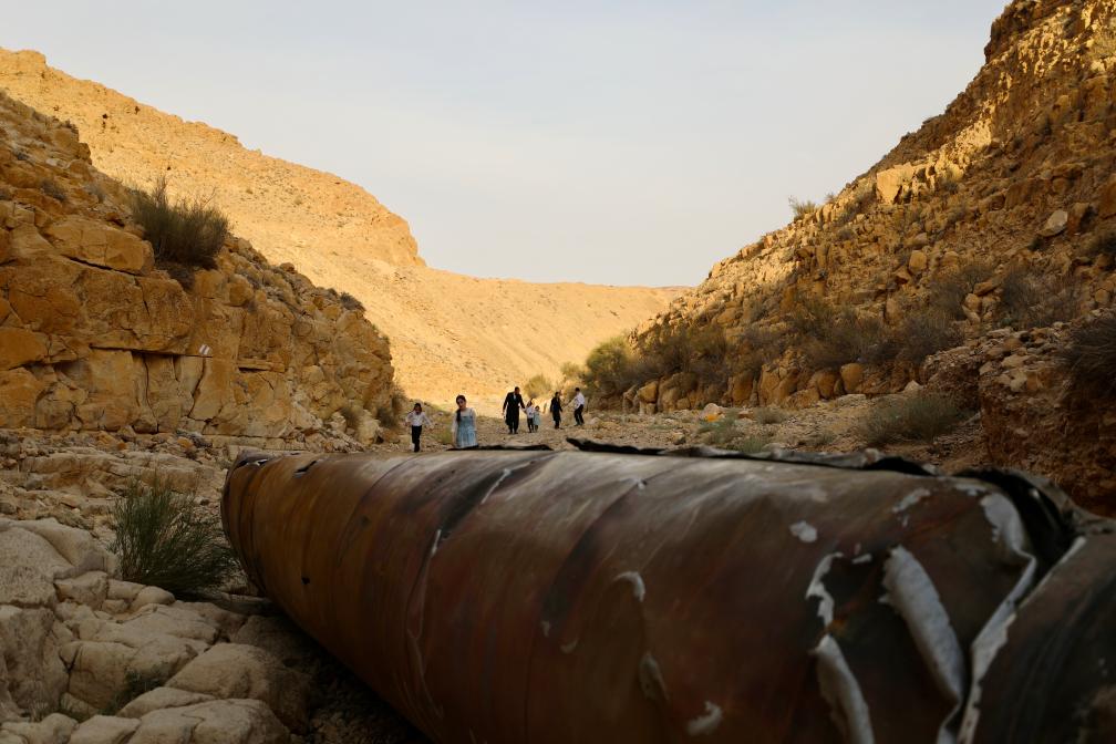 這是4月28日在以色列南部城市阿拉達附近拍攝的伊朗導彈殘骸。新華社發(賈馬爾·阿瓦德攝)