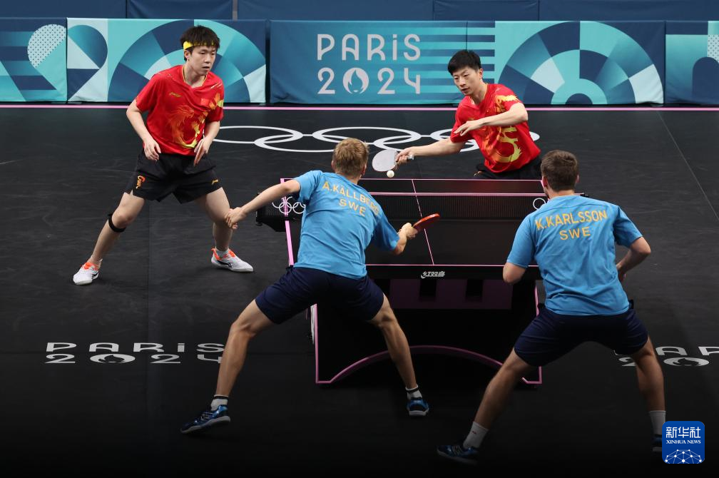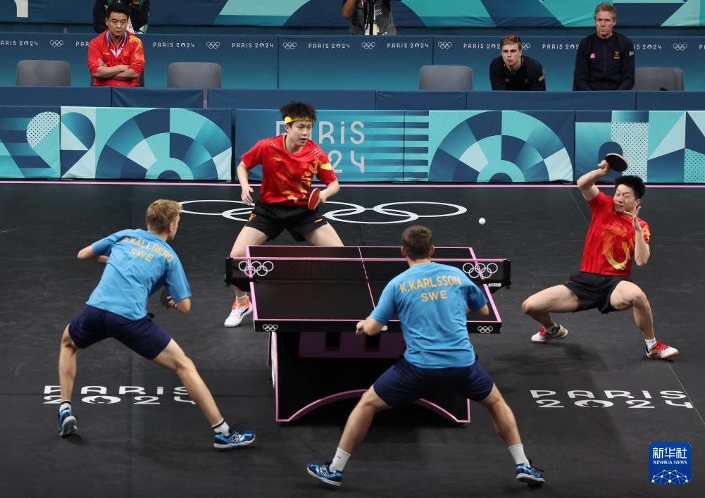 8月9日,中國隊組合馬龍(上右)/王楚欽(上左)和瑞典隊組合科爾貝里/卡爾松(下右)在比賽中。馬龍/王楚欽3比2戰勝科爾貝里/卡爾松。新華社記者 賴向東 攝