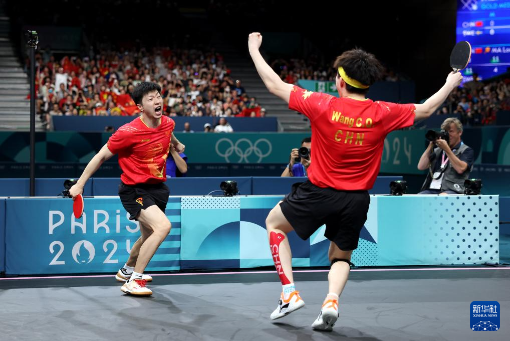 8月9日,中國隊組合馬龍(右)/王楚欽慶祝勝利。新華社記者 盧燁 攝