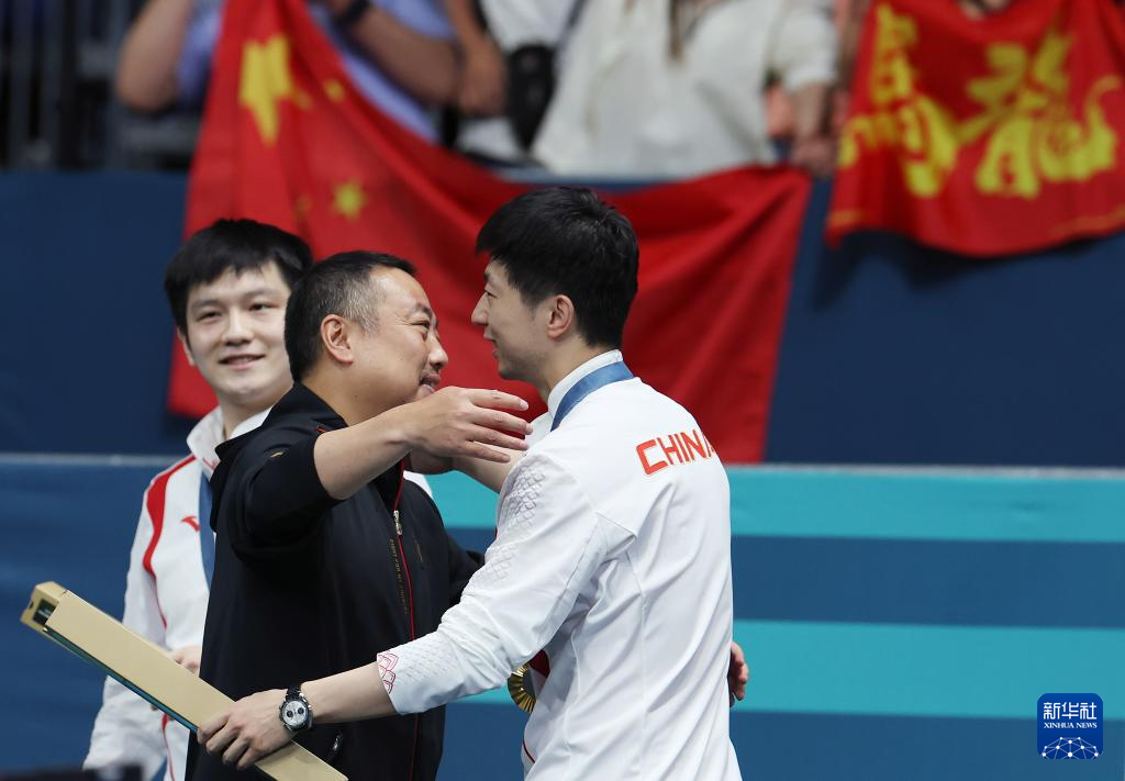 8月9日,中國乒協主席劉國梁(中)賽后與馬龍(右)擁抱。新華社記者 劉續 攝