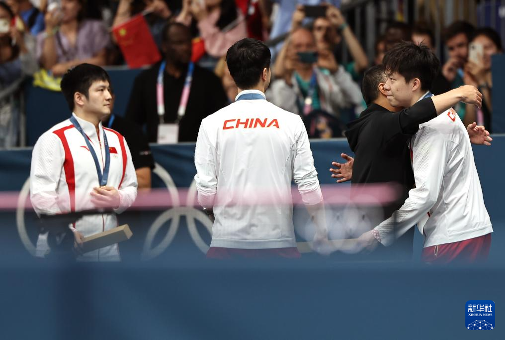 8月9日,冠軍中國隊選手王楚欽(右)在頒獎儀式上與中國乒協主席劉國梁擁抱。新華社記者 王東震 攝