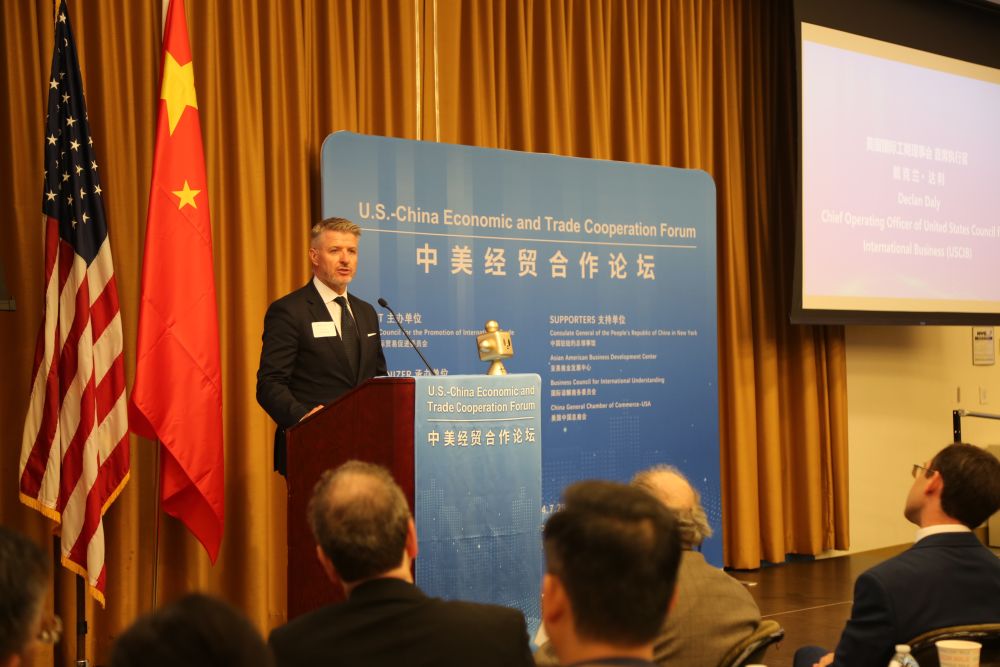 7月29日,在美國紐約,美國國際工商理事會首席運營官戴克蘭·達利在中國—美國經貿合作論壇上致辭。中國—美國經貿合作論壇29日在紐約市舉行,300余位中美企業及商協會代表出席。新華社記者劉亞南攝