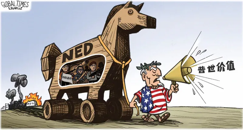 長期以來,美國將所謂普世價值工具化、武器化,煽動分裂對抗,干涉別國內政,造成災難性后果。NED就是美國政府禍亂別國的“特洛伊木馬”。圖源:《環球時報》