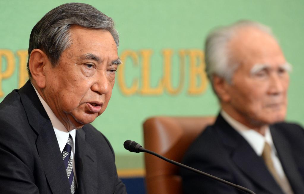 2015年6月9日,在日本東京,日本前內閣官房長官河野洋平(左)發表講話。當日,河野洋平和前首相村山富市在日本記者俱樂部舉行對談,重申承認殖民侵略歷史事實、堅持和平憲法對日本的重要意義。新華社記者馬平攝