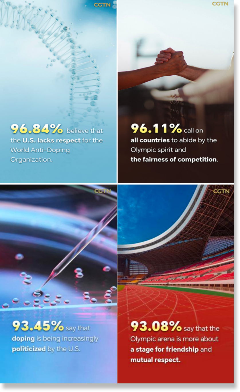 總臺CGTN先后兩次發起全球民調,調查顯示,96.84%的受訪者認為美方缺乏對世界反興奮劑機構的尊重,是在挑戰公平和權威;96.25%的受訪者痛批美國在興奮劑監管方面“雙重標準”;93.45%的受訪者表示,興奮劑問題日益被美國政治化和工具化;95.57%的受訪者認為美國反興奮劑機構或存包庇行為,為涉興奮劑的美國運動員開脫……
