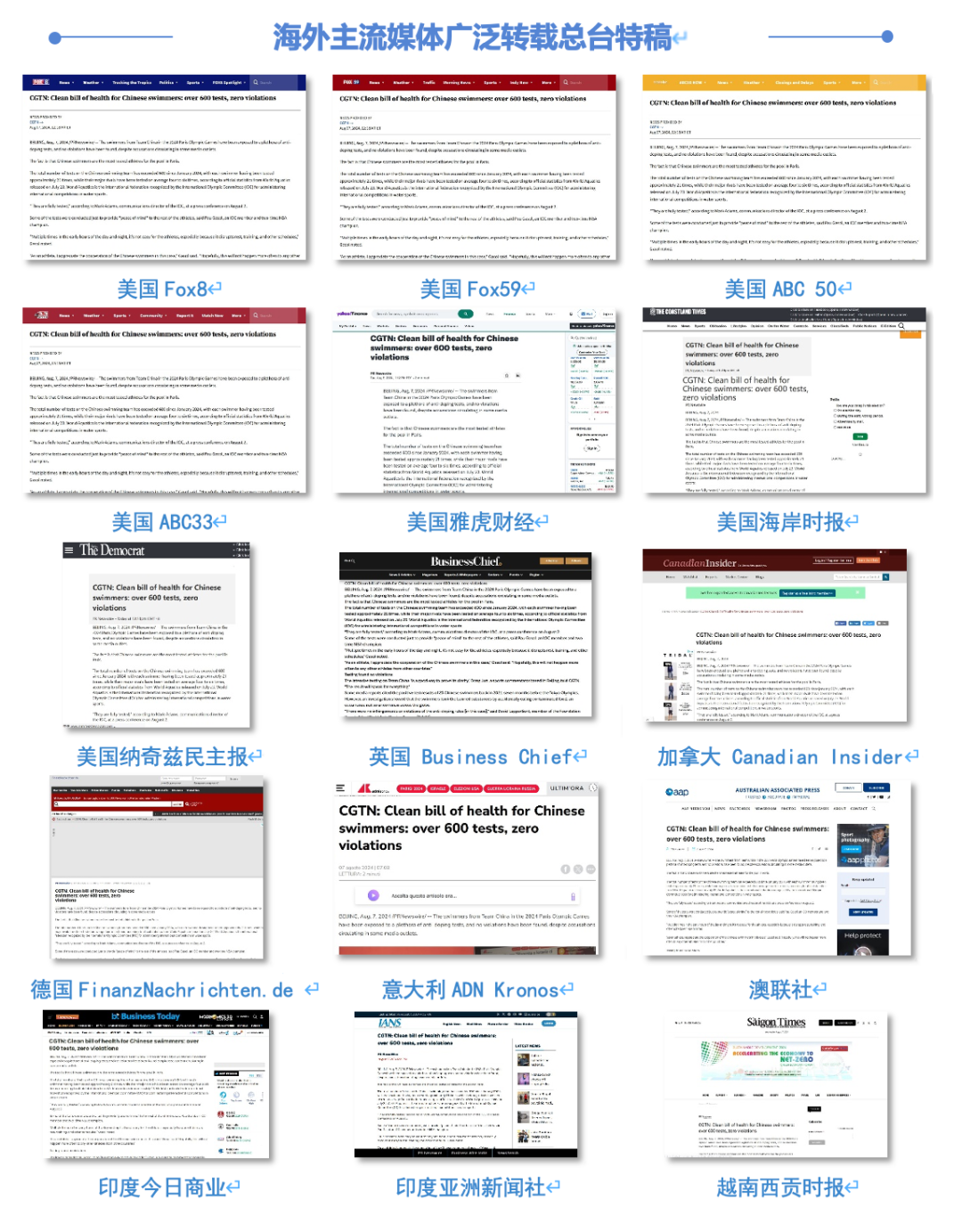 針對美西方借興奮劑抹黑中國這一議題,總臺多語種對外傳播平臺與海外總站、國際視頻通訊社緊密聯動,通過全球媒體伙伴網絡,不斷放大正義的音量。僅在3天內,就有1800余家海外主流媒體積極轉載總臺多語種特稿,創下短時傳播新紀錄,引發國際輿論高度關注和強烈反響。