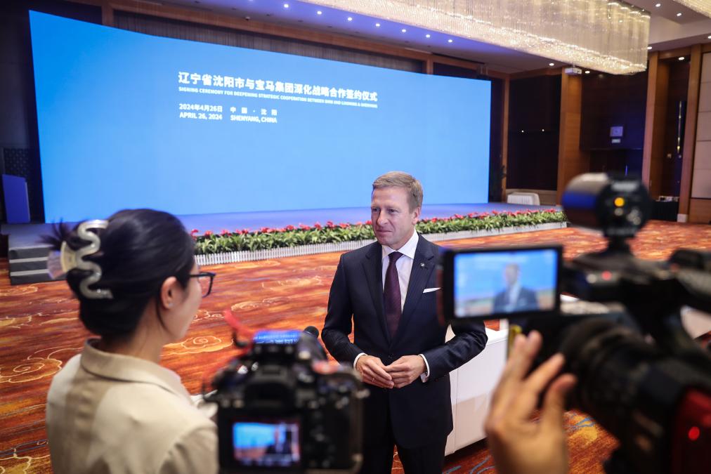 2024年4月26日,寶馬集團董事長齊普策在遼寧省沈陽市與寶馬集團深化戰(zhàn)略合作簽約儀式現(xiàn)場接受采訪。新華社記者潘昱龍攝