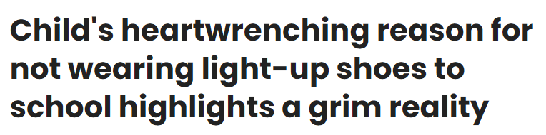 文章提到,一位名叫林賽·范·艾倫(Lindsay Van Allen)的母親在一篇帖子中講述了給上五年級的女兒梅茜(Maisy)買新校鞋時發(fā)生的事情。“在我給梅茜買上學穿的鞋時,她跟我說不想要能發(fā)光的鞋子。”她說,當女兒特別強調(diào)一定不要買那雙可愛又新奇的LED發(fā)光鞋的時候,她以為這是因為孩子長大了,要上五年級了,不想讓自己看起來很幼稚。