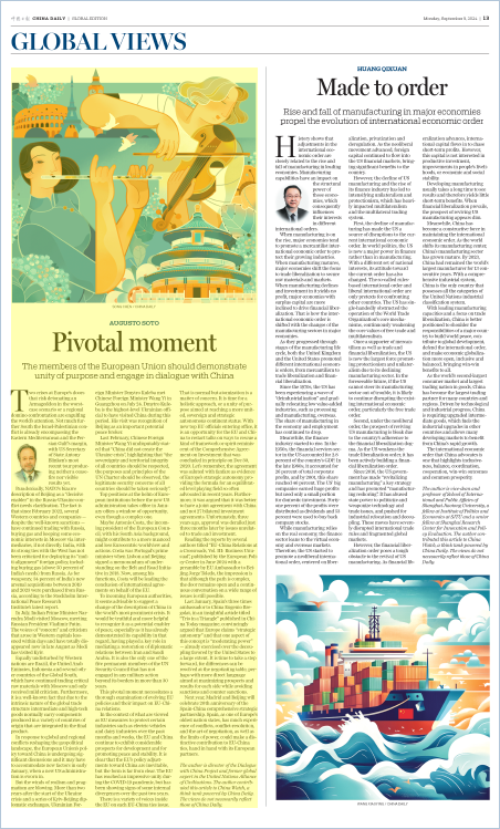 去年1月,曾三次擔(dān)任西班牙駐華大使的歐亨尼奧·布雷戈拉特在《今日中國(guó)》雜志上發(fā)表了一篇名為《三角中的三人》的文章。他指出,歐洲主張“戰(zhàn)略自主”,而這一概念的一個(gè)重要方面就是“緩沖的力量”——這種能力已經(jīng)在應(yīng)對(duì)美國(guó)力主對(duì)華“脫鉤”的過(guò)程中發(fā)揮了很大作用。這篇文章有理有據(jù),很有洞察力和說(shuō)服力。現(xiàn)在是再向前邁出一步的時(shí)候了,因?yàn)榉制缈梢栽谡勁凶郎系玫浇鉀Q,也許可以用更直接的語(yǔ)言,旨在使雙方的前景和成果最大化,同時(shí)避免陷入制裁和反制裁的循環(huán)。