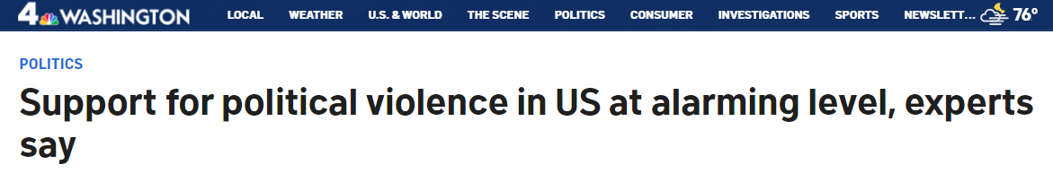 加州大學戴維斯分校(University of California - Davis)的一個小組最近就美國人對政治暴力的支持度進行了調查,結果發現,有25%的受訪者認為,為了推進政治目標的暴力通常或總是合理的。雖然這一數字較去年以來略有下降,但這中間潛在的危險卻更大,因為支持暴力的人更有可能使用槍支來推動政治目標的實現。
