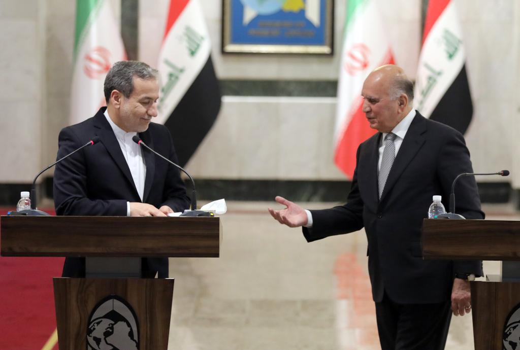 10月13日,伊拉克外長侯賽因(右)同到訪的伊朗外長阿拉格齊在首都巴格達舉行會談后參加聯合記者會。新華社發(哈利勒·達伍德攝)